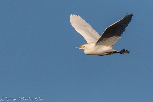 A otra de las aves zancudas que pude fotografiar en ese entorno, fue a la Garcilla bueyera (Bubulcus ibis) que está considerada como una de las garzas más pequeñas. Tienen un tamaño de entre los 45-52 cm de longitud con una envergadura que ronda entre los 82-95 cm. Su peso puede llegar hasta los 500 gr. Apenas existen diferencias sexuales.