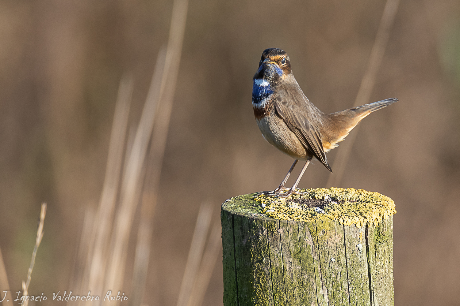 Aprovecho la ocasión para comentar que el Ruiseñor pechiazul (Luscinia svecica) puede presentar una notable variabilidad en la coloración de su plumaje y en su biometría, por lo que en la actualidad se han llegado a describir hasta 11 diferentes subespecies. En Europa occidental se reconocen tres: “L. s. svecica”, “L. s. cyanecula y “L. s. nannetum”. También entre ellas, recientemente se ha reconocido a la “Luscinia svecica azuricollis”, que es la subespecie endémica en la Península Ibérica (cordillera cantábrica y sistema central) y cuyo rasgo identificativo principal es el de carecer de la medalla blanca en el centro del babero azul.