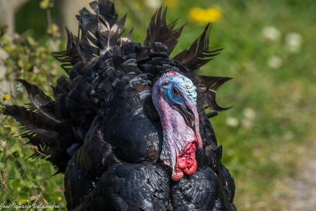 Impresionante el retrato de esa enorme ave doméstica, con su característico “moco de pavo” de colores rojizos que contrasta notablemente con su azulada cara y su plumaje totalmente negro brillante.