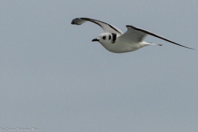 Otra especie de gaviota a la que pude observar ese día en paso migratorio, fue la Gaviota cabecinegra (Larus melanocephalus). Lucían sus bellos plumajes invernales y, en algunos casos, formaba algunos bandos conjuntos con las gaviotas tridáctilas.