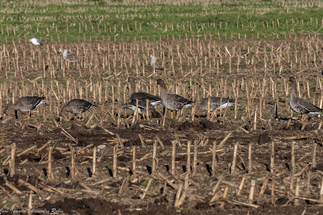 Comparto en ésta nueva entrada el reportaje fotográfico que a lo largo de la primera quincena del pasado mes de diciembre pude realizar a un grupo de siete ánsares caretos (Anser albifrons).